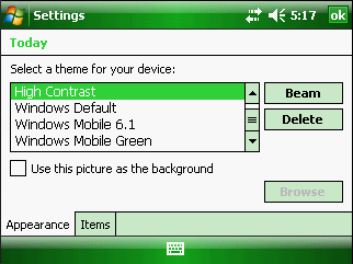 In the Appearance tab, select High Contrast in Select a theme for your device. Tap OK and then the Close icon (X) to return to the Today screen.