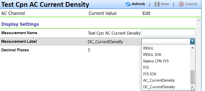 Measurement Label — Unit of measurement, such as volts or A/m2. Users may select predefined units from the drop-down menu, or enter a custom label.